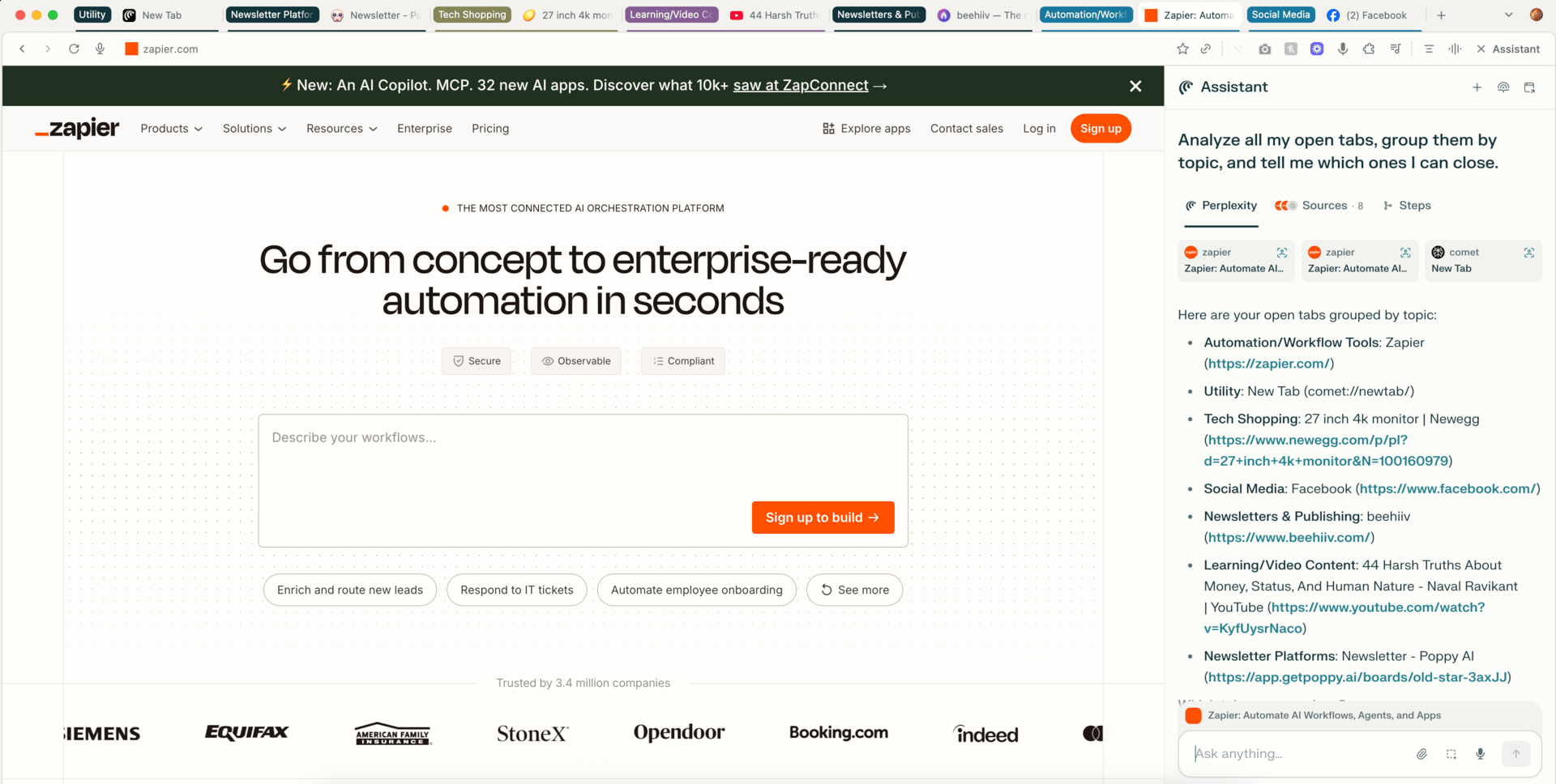 But you can ask Comet: "Analyse all my open tabs, group them by topic, and tell me which ones I can close."