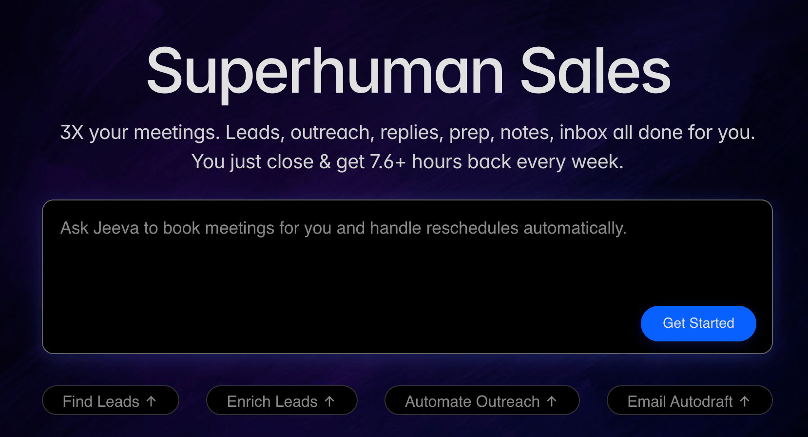 JeevaAI is an agentic sales assistant that finds leads, enriches their data across 20+ sources, and sends personalised outreach across email and LinkedIn - all automatically. One company tripled their pipeline without adding headcount. Sales teams using JeevaAI reclaim 30+ hours weekly for actual relationship building instead of grunt work.