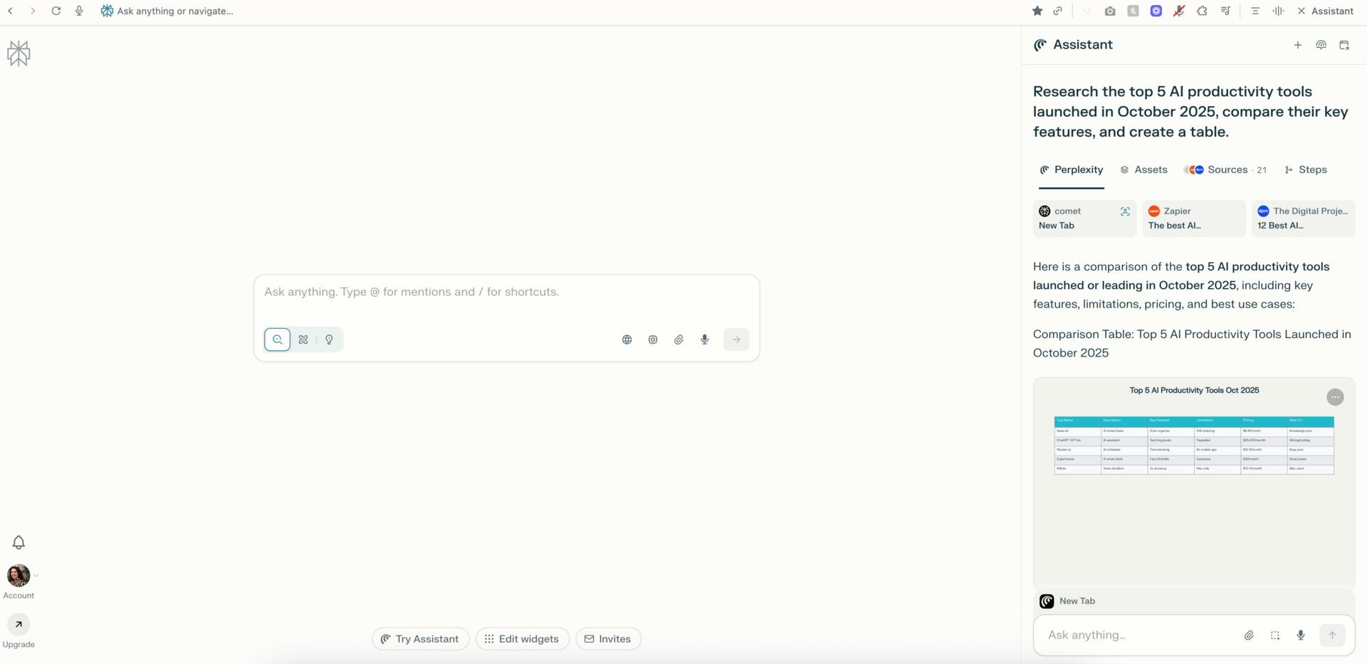 I asked Comet: "Research the top 5 AI productivity tools launched in October 2025, compare their key features, and create a table."