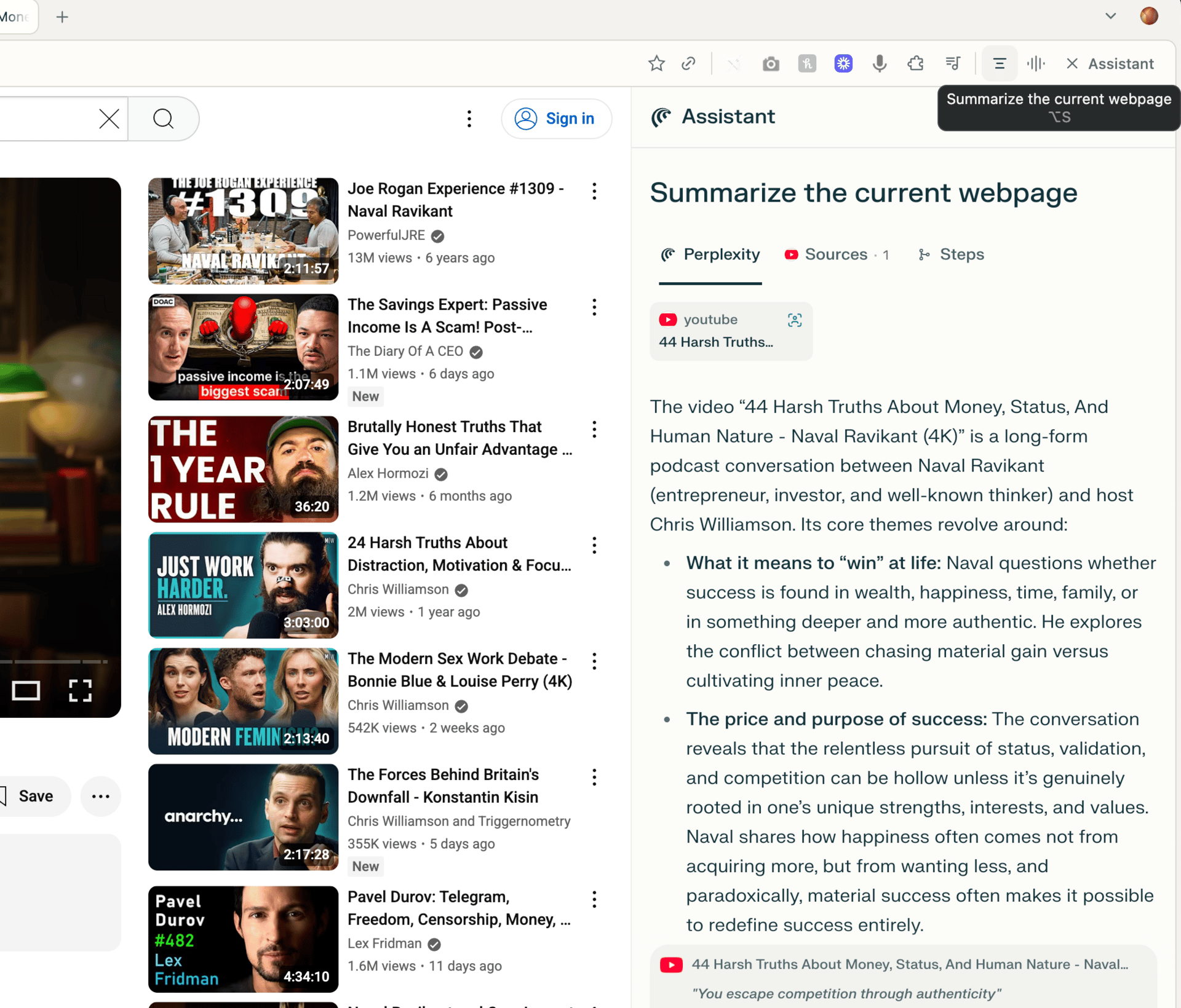 Instead of scrubbing through the entire video, I asked Comet: "Find the timestamp where Naval talks about standing out among the competition."