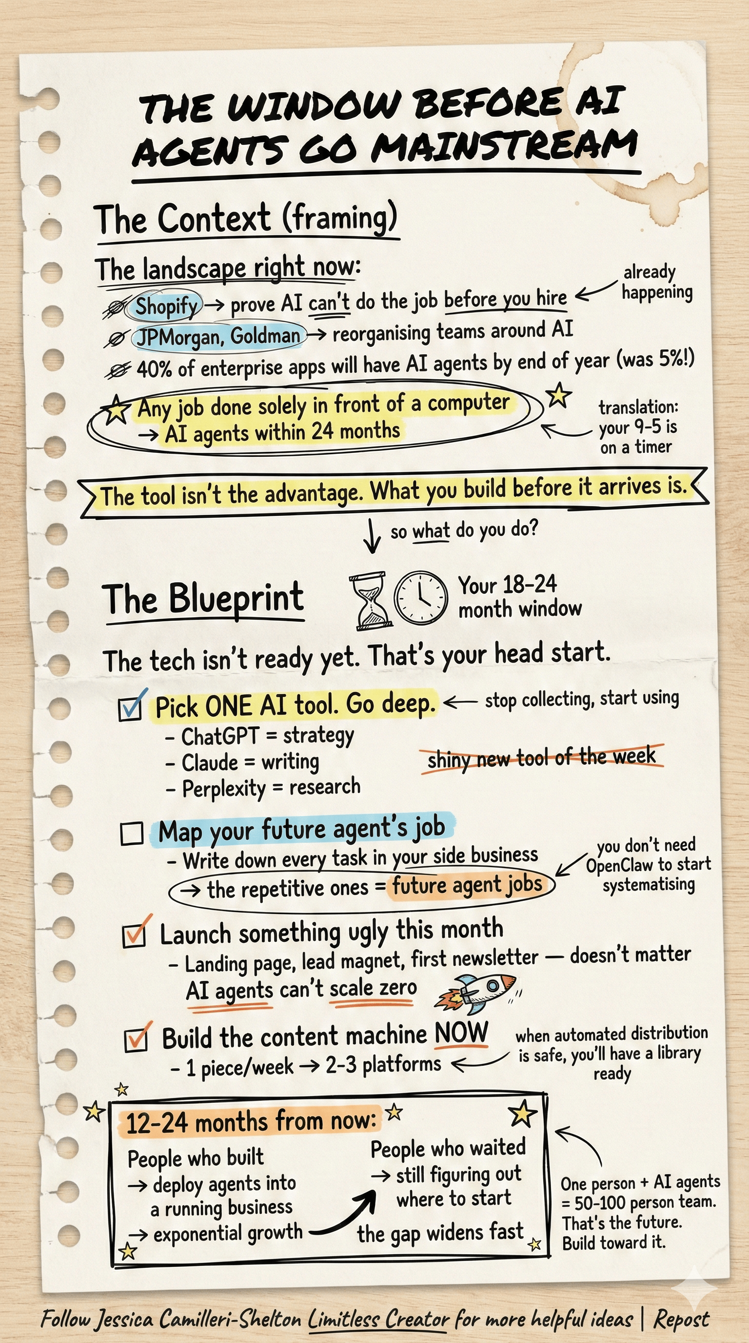 You have somewhere between 12-24 months before AI agents go mainstream, which means the people who use this time to build a brand, grow an audience, and develop real systems will deploy these agents into a running business on day one.