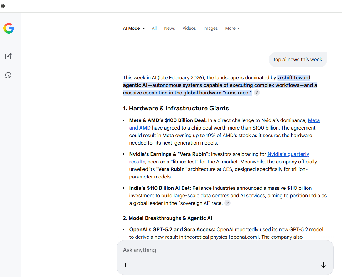 You‘ve probably noticed Google Search got a massive upgrade. Now AI Mode turns your regular searches into live conversations. Instead of scrolling through 10 blue links, you get a synthesised, contextual answer with sources. You can ask follow-up questions, go deeper, and explore topics layer by layer. If you're doing any kind of research for content, client work, or your side project (or anything really), this changes how fast you can get from "lemme Google this" to "I have an answer I can actually use."