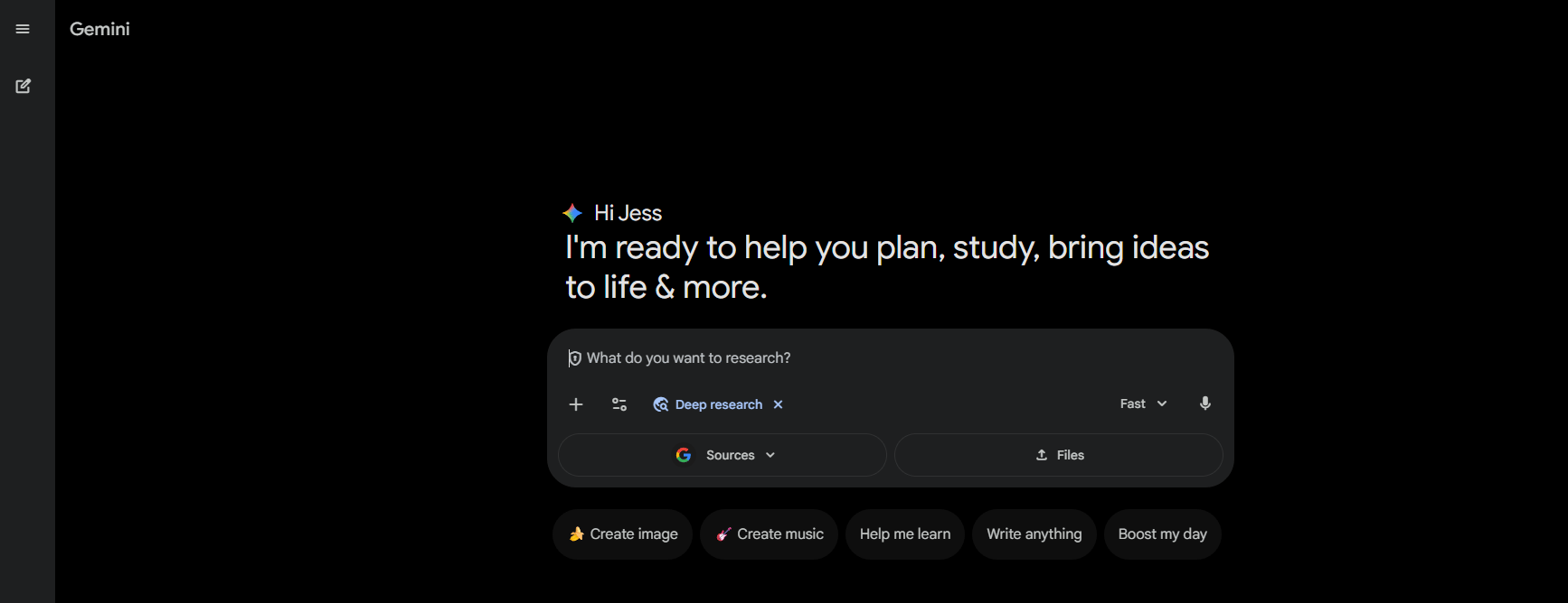 I haven't had too much interaction with this tool to date. In short, you give Gemini a research question, it shows you a plan, and then it goes off and browses 100+ sources autonomously. 5 - 15 minutes later, you get a structured, multi-page report with citations and analysis. You can upload your own PDFs, pull in files from Google Drive, and it'll weave everything together. Available free on the Flash model, or with the full Gemini Advanced subscription for deeper dives. Just go to Gemini, navigate to the main context window and select ‘Deep research’ from the tools drop-down list.