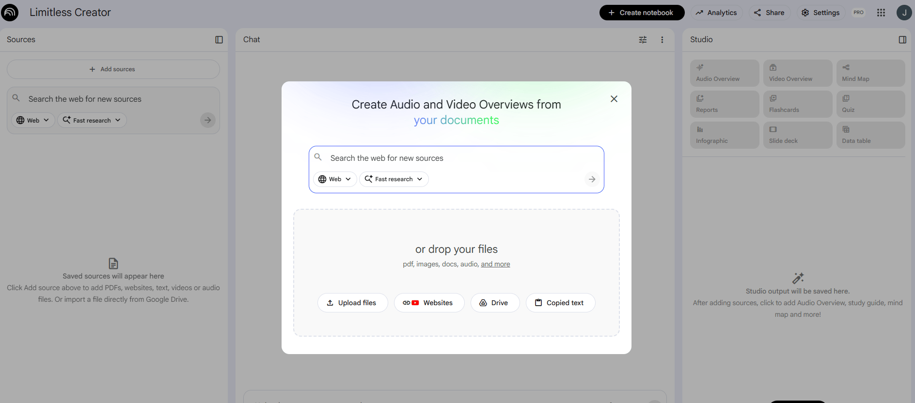 Upload any source material (PDFs, YouTube videos, articles, transcripts, even audio files) and NotebookLM turns it into a personalised AI assistant that only knows what you've fed it, which means almost zero hallucination. It generates audio overviews, flashcards, quizzes, summaries, and more. I've been using it to break down complex topics, prep for content, and train chatbots on specific subjects. It's free and it's one of the most underrated tools on this list.