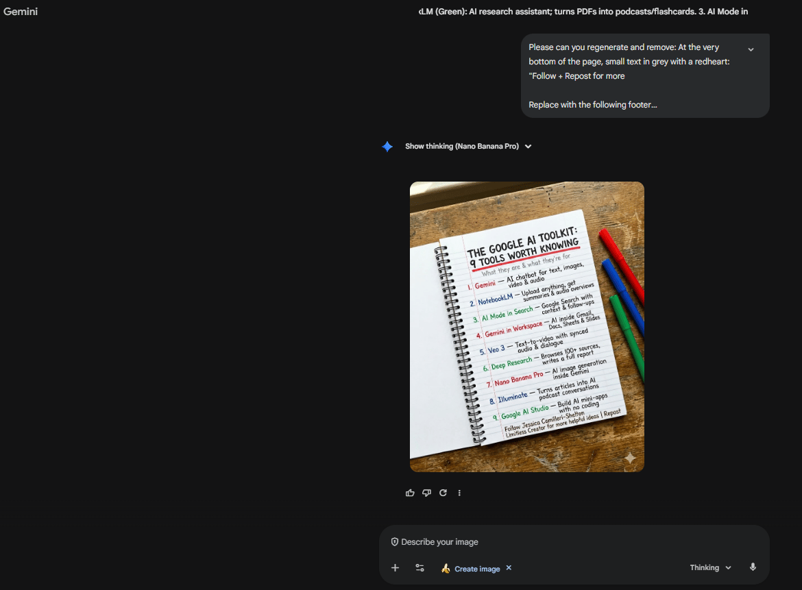 You just read through 9 Google AI tools. Now here's how to turn any list into a shareable infographic using one of them. This prompt works inside Gemini (which uses Nano Banana Pro for image generation) and creates a realistic notebook-style flat-lay graphic. These infographics are going viral on LinkedIn because they look like someone actually wrote it out by hand.